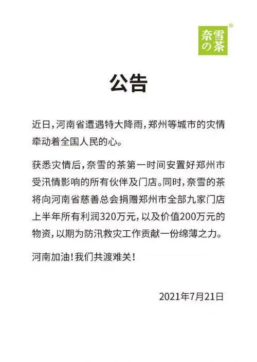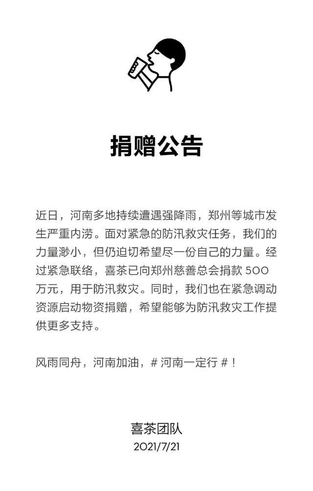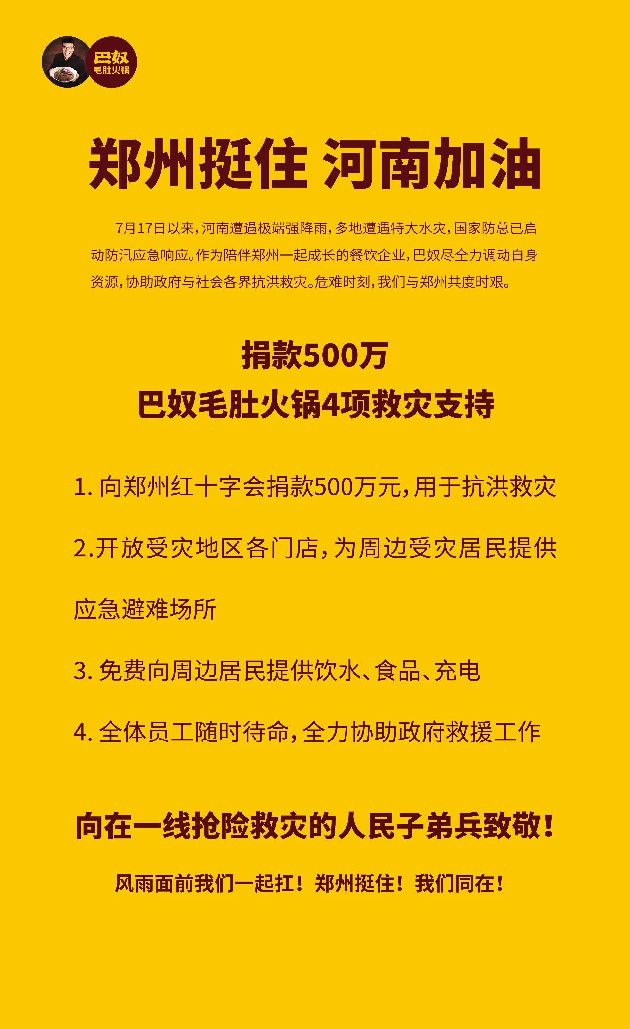 小龙坎通过成都慈善总会向郑州捐助200万元物资,且开放郑州所有小龙坎门店免费为居民与抗灾人士提供简餐。