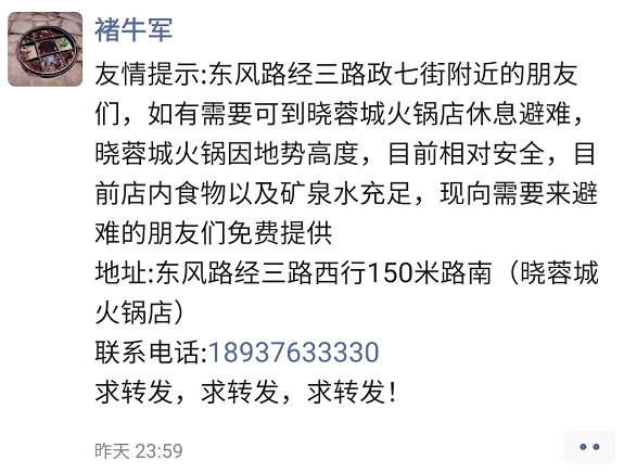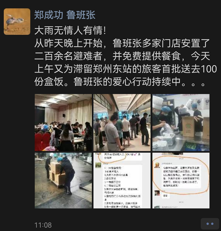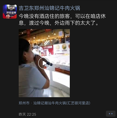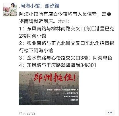 在郑州的餐饮人纷纷以海报、朋友圈的方式大声疾呼,表示帮助被困群众,协助救援队伍作业……