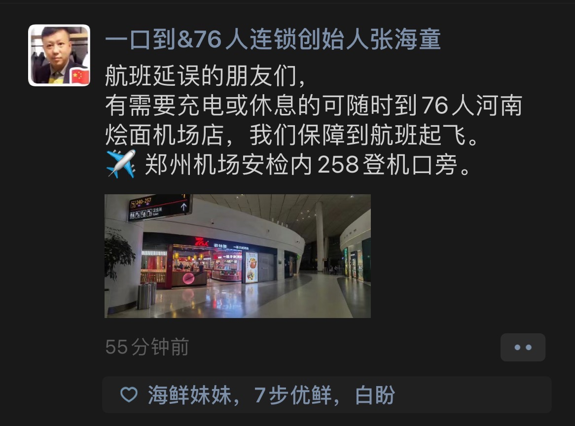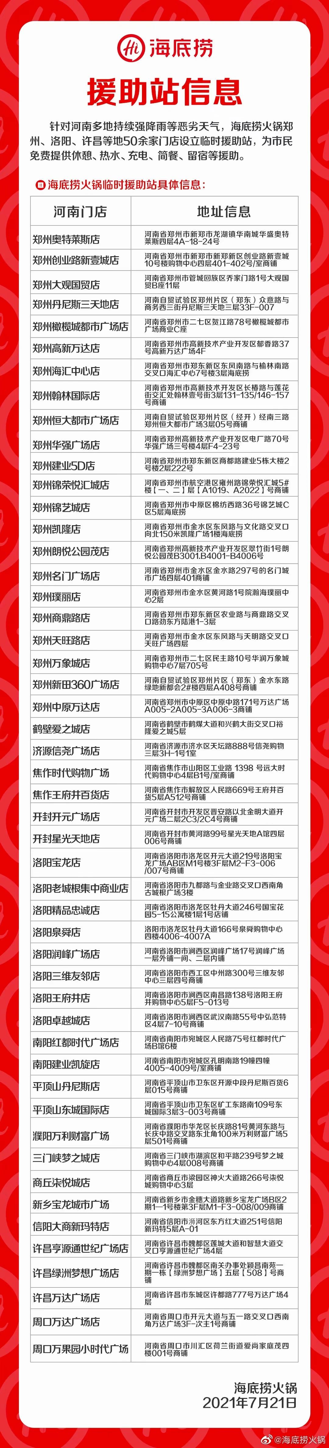 海底捞在郑州、洛阳、许昌等地50余家门店设立临时援助站。