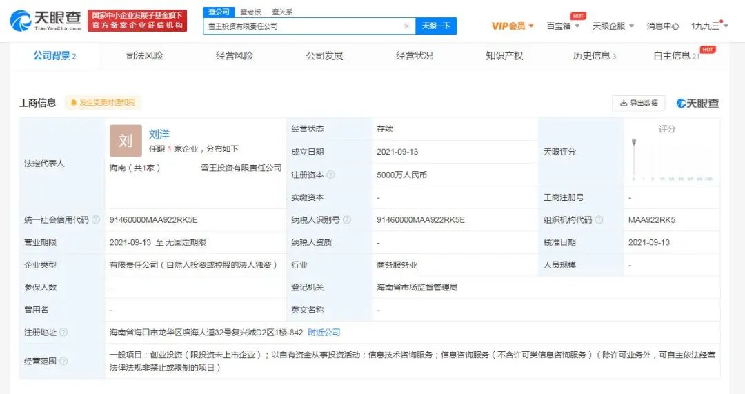天眼查APP显示,9月13日,雪王投资有限责任公司成立,注册资本5000万人民币,法定代表人为刘洋,经营范围含创业投资(限投资未上市企业);以自有资金从事投资活动等。