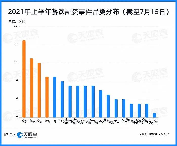 其中,茶饮、咖啡、面食是融资事件数TOP3品类,烘焙、酒类等零售属性突出的品类处在融资第二梯队。