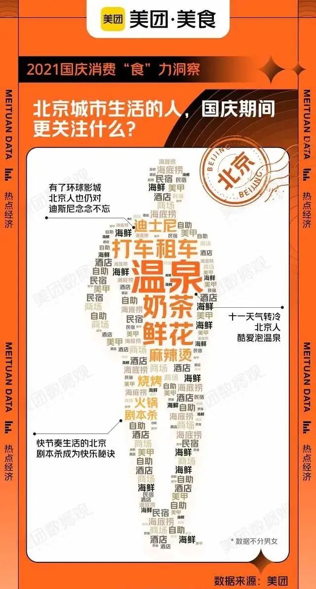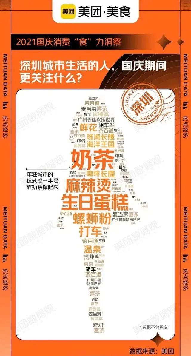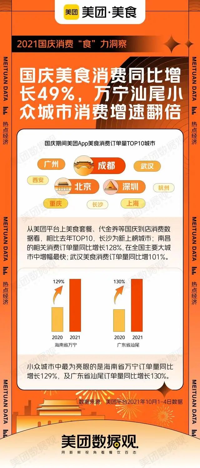 10月6日,美团发布《2021年国庆黄金周消费趋势报告》。报告显示省内游是今年国庆期间人们首选的旅游过节方式,全国异地消费用户占比22.4%,本地消费用户占比77.6%。随着国内疫情防控形势好转,国人消费信心进一步增强,十一黄金周消费经济持续回暖。综合美团各业务(餐饮、住宿、旅游、娱乐、出行等)的消费数据来看,今年国庆节期间的总体消费额同去年国庆节相比上涨29.5%,较2019年国庆节同比上涨51.6%。今年国庆期间,婚宴、生日宴会、亲朋好友聚餐等需求增加,促使全国餐饮消费一片红火。从美团上美食套餐、代金券等到店消费数据看,今年国庆期间通过美团App团购美食并到餐厅消费的订单量同比去年国庆增长49%。同时,大众点评App数据显示,国庆期间必吃榜餐厅订单量环比节前增长50.8%。美团数据显示,今年国庆长假美食消费热门TOP10城市为成都、北京、深圳、广州、武汉、重庆、上海、西安、杭州、长沙,其中长沙为今年新上榜城市。此外,南昌的美食相关消费订单量同比增长128%,在全国主要大城市中增幅最快,去年受疫情影响严重的武汉同比增速达到101%。从餐饮品类来看,火锅成为国庆期间订单量最高的正餐品类,并且仍然保持着较高的增速,较去年国庆增长29.9%。美团买菜数据显示,广州火锅订单量增长78%、深圳火锅订单量增长65%、上海火锅订单量增长34%、北京火锅订单量增长26%,其中国庆节假期前4天,广州消费金额最高的一笔订单就是购买火锅食材,总共花费了800元。