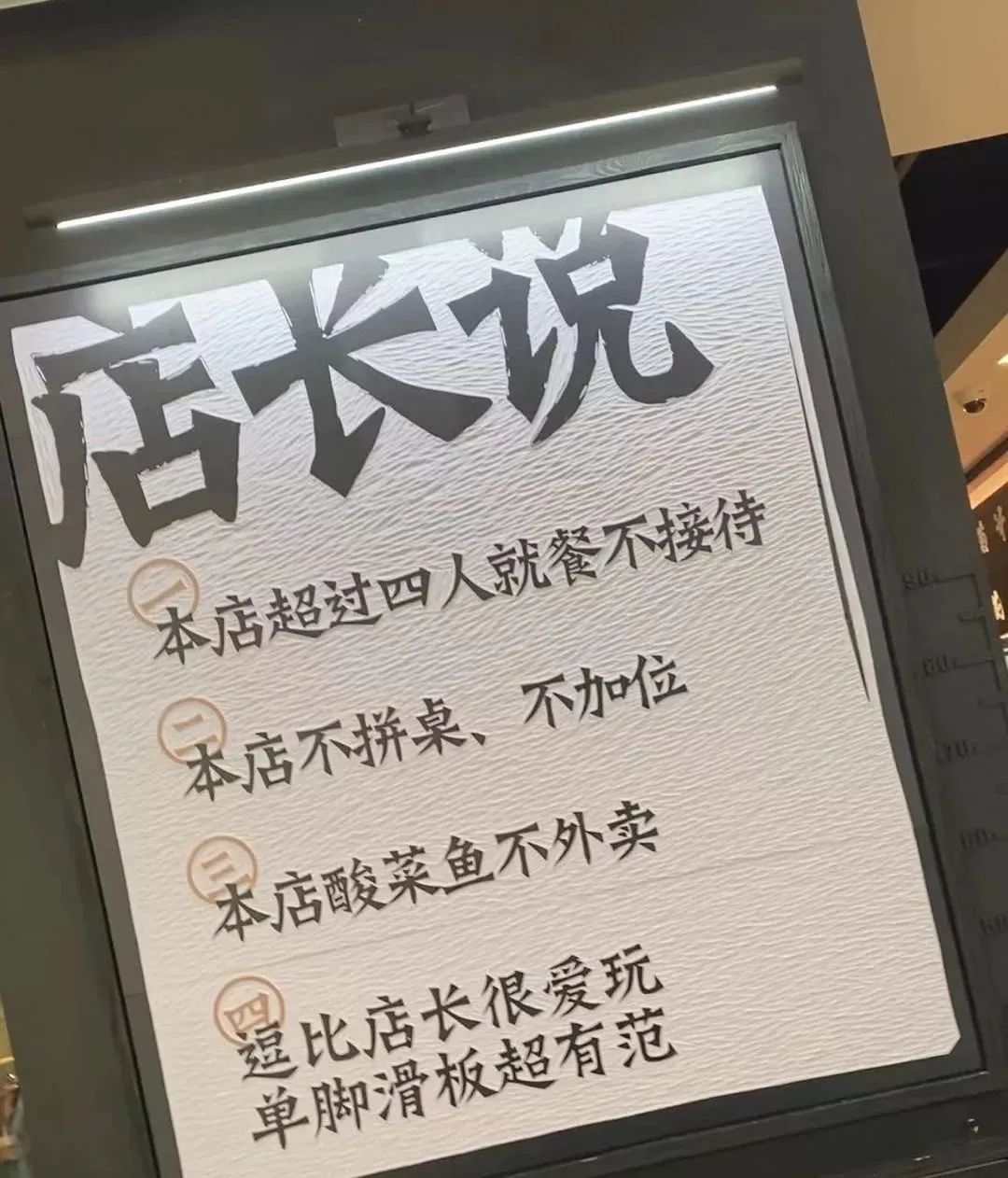 细心的人会发现,每家太二酸菜鱼的门店门口都有一块店长说的牌子,上面写着“本店超过四人就餐不接待”、“本店不接受拼桌、不加位”、“不接受调整辣度”、“本店酸菜鱼不外卖”以及关于相关门店店长的描述。