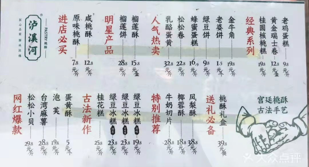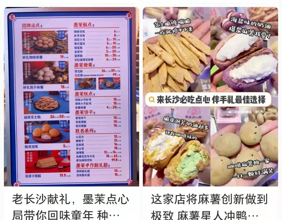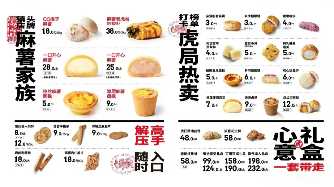 2019年在长沙开出的品牌,以复兴中式糕点为使命,坚持手工现制,用“凡事多用点心”的态度,在中西点心中汲取创作灵感,融入当代年轻人生活方式与口味,用心做好每一款点心。据悉,虎头局的创始人、CEO胡亭曾在国内互联网蛋糕品牌廿一客21Cake任职。麻薯老虎卷、QQ提子麻薯、一口开心麻薯、双层麻薯盘挞、榴莲炸弹泡芙、纯乳酥酥泡芙……主打着新中式点心年轻化,将经典的中式点心结合流行的元素,譬如麻薯,就是虎头局找到的“财富密码”。超浓奶香,糯叽叽的,还会拉丝,提升了产品的风味与层次。另外,将产品规格进一步mini化,并去掉了传统麻薯配方中主动添加的砂糖,突出原材料本身的微甜口感。2020年,在长沙创立的墨茉点心局,仅短短一年时间,便获得了5次融资。以国潮元素的应用打通传统糕点的边界,深受年轻人的喜爱。据微信公众号上显示的数据,目前,已经开了26家店。鲜乳提子麻薯、鲜乳咖啡麻薯、芝士脆、彩虹爆浆麻薯、脆皮泡芙……同样以现烤的Q弹麻薯作为切入口,嚼劲十足,风味清新,再搭配国潮文化的融入,成功反转了之前“土气憨厚”的中式糕点印象,并成功通过抖音、小红书的大量打卡视频以及笔记的带动之下,成为新中式糕点届炙手可热的新星。此外,菜单中还有售卖饮品,一口糕点一口饮品,搭配得宜。詹记算是这几家店里的老前辈了,起源于徽州婺源(今属江西)詹氏家族代代相传手作传统糕点店。詹老先生于1955年特地制下“詹记”牌匾,并以“詹记”为名开下店铺。他们家的定位是坚持从食材出发,制作醇正原味,传承着“ 良心做饼,善心做人 ”的家训,诠释出老徽州的人情风味。同样主打着手工现制,在精准的力度和温度把控下,出品百吃不厌的风味。如今,詹记除了深耕安徽之余,也已经在武汉、上海、北京、长沙等地留下了足迹。桃酥、无水蜂蜜蛋糕、鲜奶泡芙、绿豆冰糕、海苔肉松小贝、乳酪蛋黄、麻薯……中国匠造之下的百年桃酥,酥香四溢,且顺应着市场不断推成出新,譬如招牌桃酥,就研发了祁门红茶、巧克力、海苔芝士、糖醇猴头菇、红糖核桃这几种深受时下消费者欢迎的口味。以深耕细作的精神,将根植于记忆深处的安徽味道带给更多的人。南京注册成立的新中式糕点品牌,同样以桃酥闻名。坚持匠心手作,源味流传,以真材实料,新鲜现烤,传递酥香本味。给我印象比较深的是,泸溪河的门店可以说是非常多,我数了下泸溪河官方微信公众号上显示的门店数,已超200多家。覆盖了南京、扬州、苏州、无锡、南通、上海、杭州、广州、北京、深圳等24个区域,扩张的速度非常快。桃酥、原味泡芙、枣泥核桃酥、松松小贝、盘挞、绿豆冰糕、乳酪蛋黄、台湾麻薯……秉承着古法做饼的技艺,新鲜现烤,用料讲究,在口感和味道的平衡上把握得有一手。同时在性价比上也可以说是相当不错。我认为很大一部分原因,是产品打出了差异化,且借助了国潮之势,稳稳抓住了年轻消费者。