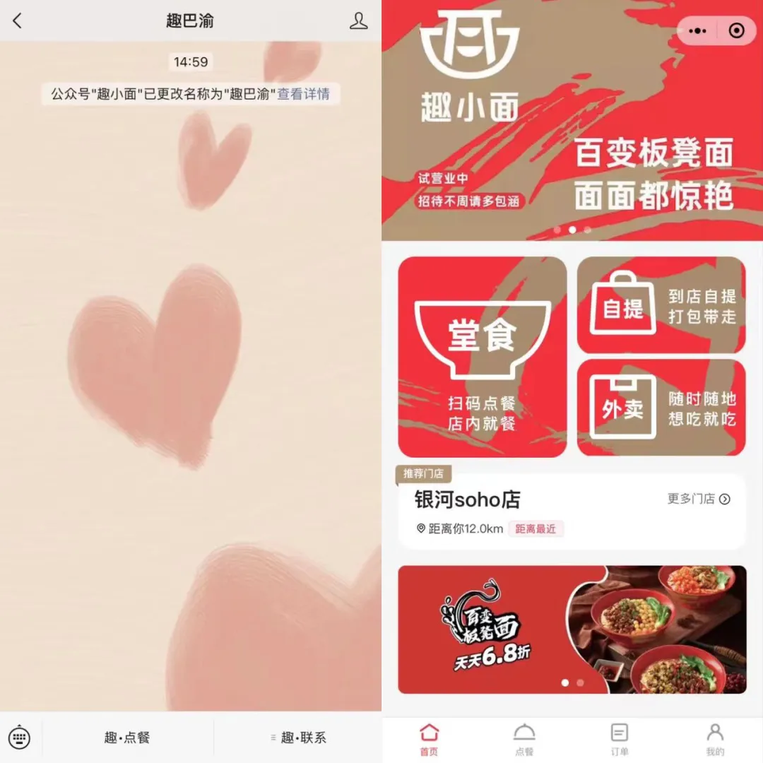 餐饮O2O发现,“趣小面”官方微信公众账号突然更名为“趣巴渝”。不过,点餐页面仍旧显示为“趣小面”(应该是还没更新)。