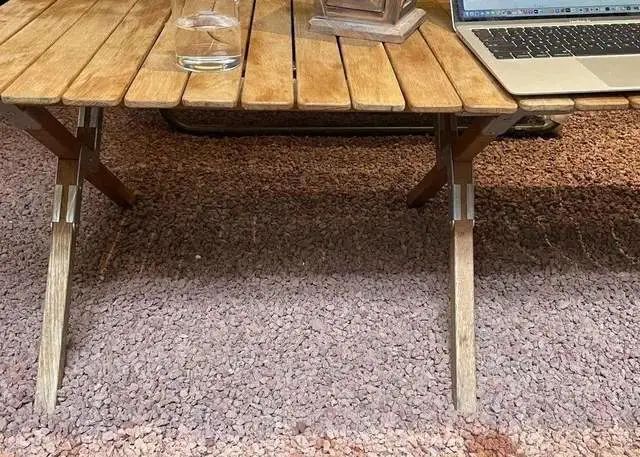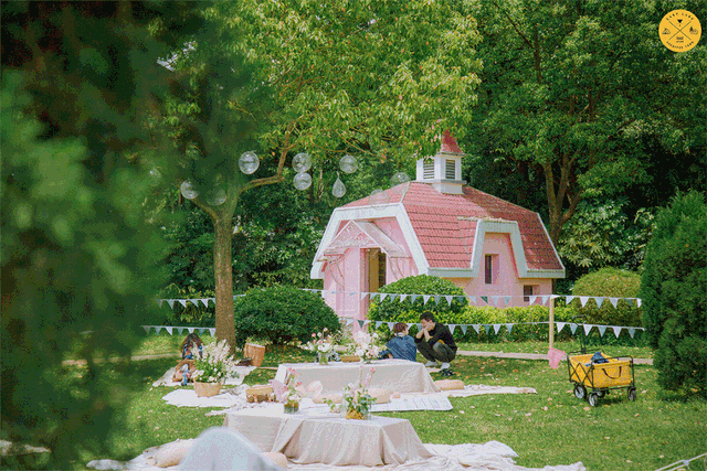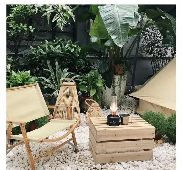 大地色系的帐篷桌椅,庭院小路铺满了白色石子,秋天地上积满的落叶随意一拍都是大片。