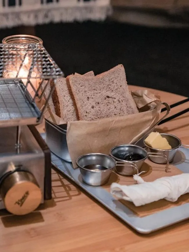 在店内,可以点上一份面包片,坐在帐篷里自己动手现烤,也可以自磨自冲一杯手磨咖啡,让自己仿佛真的置身于户外营地之中。