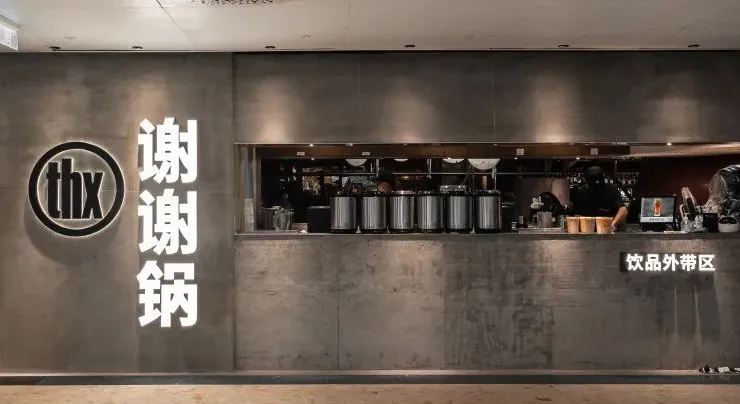 谢谢锅深圳首店位于皇庭广场G层,临街门口设有外摆区和外带区,茶饮外带也是谢谢锅非常重要的特色。面积有600平方,40多张台位。