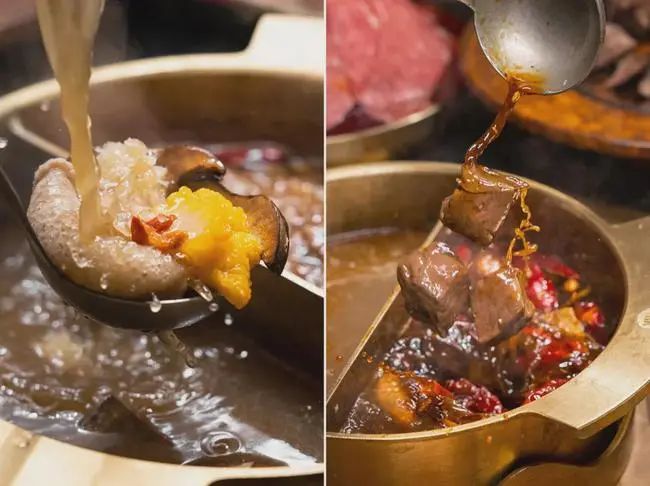 门口的主题墙采用的是飞机上的航空餐车箱,供客人休息社交+拍照发圈,店内充满欢快热闹的社交氛围,年轻人喜欢。个性做足共性做透,采取“千店千面一店一景”设计,三个城市门店三种风格,共性都是紧紧围绕年轻人来设计。在探店过程中,O2O君不断碰到有餐饮同行也来打卡消费,纷纷表示体验惊奇出彩。走进店内,每张餐桌上都放着造型独特的铜铸“火山锅”,外圈金属盘可以烧烤,中间两格涮火锅。一锅两吃,一份钱吃到2种菜的感觉。