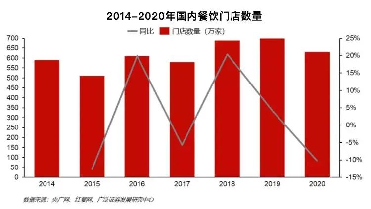据《2021中国餐饮业年度报告》发布的数据,中国餐饮市场一直健康成长,市场规模从2014年的2.9万亿增长至2019年的4.7万亿,年复合增长率达10.1%。然而,受疫情的影响,2020年餐饮市场规模下滑15.4%至4.0万亿,可谓“断崖式”下跌。